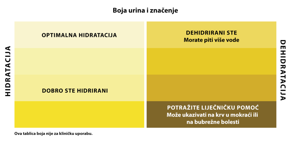 Dok vi osjetite žeđ, vaša hidratacija može biti preniska, što je također povezano sa spomenutim neugodnostima poput umora ili glavobolje. Stoga boja urina može biti korisniji signal dovoljne hidratacije. Trebao bi biti lagan ili bistar, kao što je prikazano u sljedećoj shemi boja. [32]