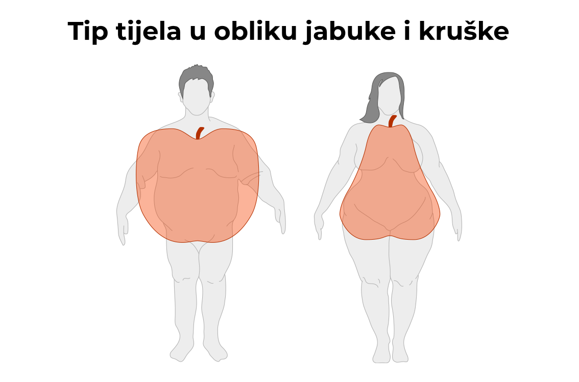 - Abdominalna pretilost – Višak masnog tkiva oko struka, definiran kao opseg struka iznad ~102 cm kod muškaraca i ~89 cm kod žena.