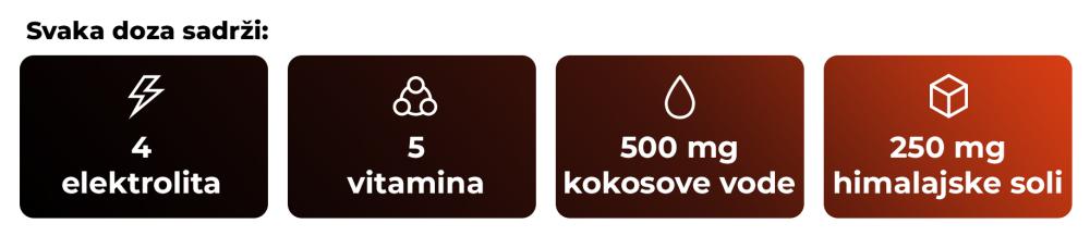 Okus šumskog voća: Kalijev citrat, regulator kiselosti (limunska kiselina), kokosova voda u prahu, arome, natrijev citrat, betain HCl, magnezijev malat, himalajska ružičasta sol, sladila (sukraloza, acesulfam K), sredstvo protiv zgrudnjavanja (silicijev dioksid), bojilo (crvena cikla), vitamin C (L-askorbinska kiselina), vitamin E (D-alfa-tokoferil acetat), niacin (nikotinamid), vitamin B6 (piridoksin hidroklorid), vitamin B12 (cijanokobalamin).
