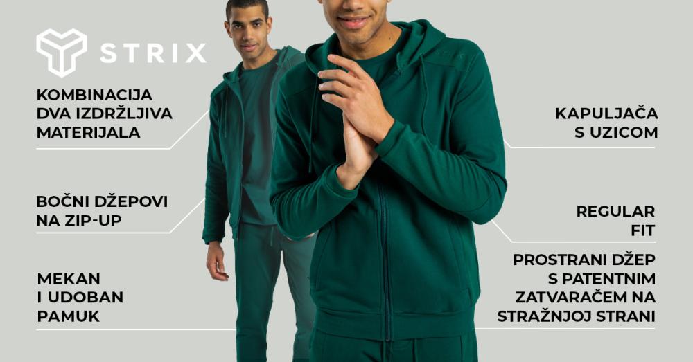 Ova kombinacija osigurava da je ugodno mekan i udoban. Elastični porub tada jamči savršeno prilagođavanje vašem tijelu. To ga također čini svestranim komadom pogodnim za razne aktivnosti. Na primjer, pružit će vam vrhunsku udobnost tijekom slobodnog vremena ili će vam ponuditi prozračnost i učiniti da se manje znojite tijekom neke sportske aktivnosti ili vježbanja u teretani. Osim toga, hoodie s patentnim zatvaračem lako je kombinirati s različitim komadima u vašem ormaru. Daljnji bonus je praktični stražnji džep s patentnim zatvaračem koji će pouzdano pohraniti vaš telefon, ključeve ili torbicu za bežične slušalice dok uživate u ritmu svojih omiljenih pjesama. Pridružite se eliti formiranoj oko brenda STRIX i u potpunosti izrazite svoju ljubav prema aktivnom načinu života.